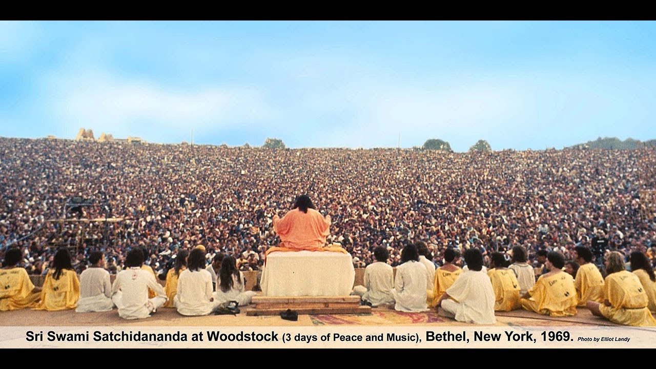 Hereās a film of Swami Satchidananda opening the Woodstock festival. He was brought in to calm the crowds and start the festival with a good spiritual vibe. He had to be helicoptered in because the road into the festival was jammed with parked cars for miles.